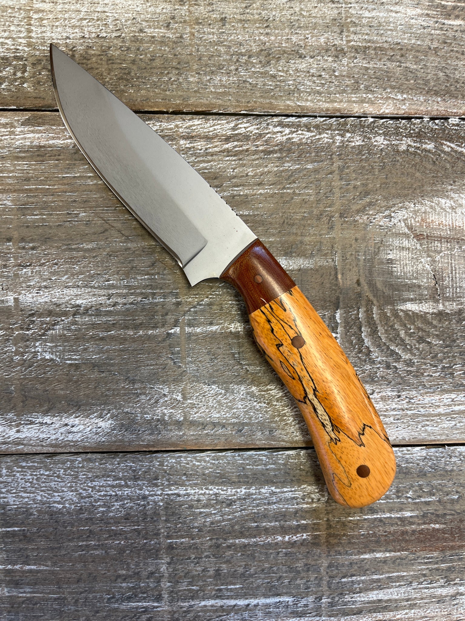 I have been making this knife for a long time,overall length 9”.blade length from tip to guard 4 1/2”.Handle material stabilize spalted maple.Bolster micarta.Steel 440c. Sheath leather.