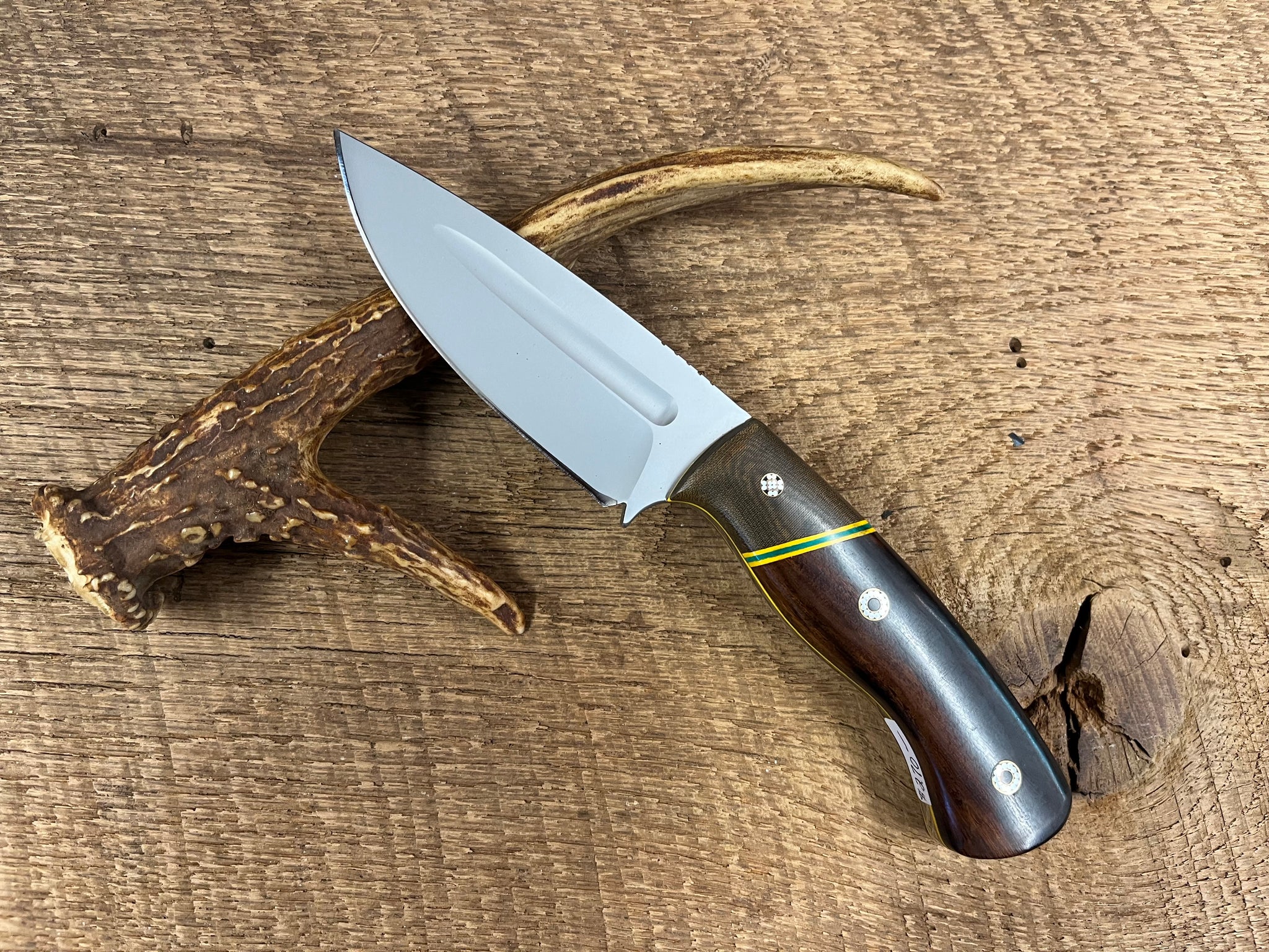 A great hunter with a fuller, overall length 8",blade 4". desert ironwood handle micarta bolster,mosaic pins ,steel AEBL stainless Leather sheath.