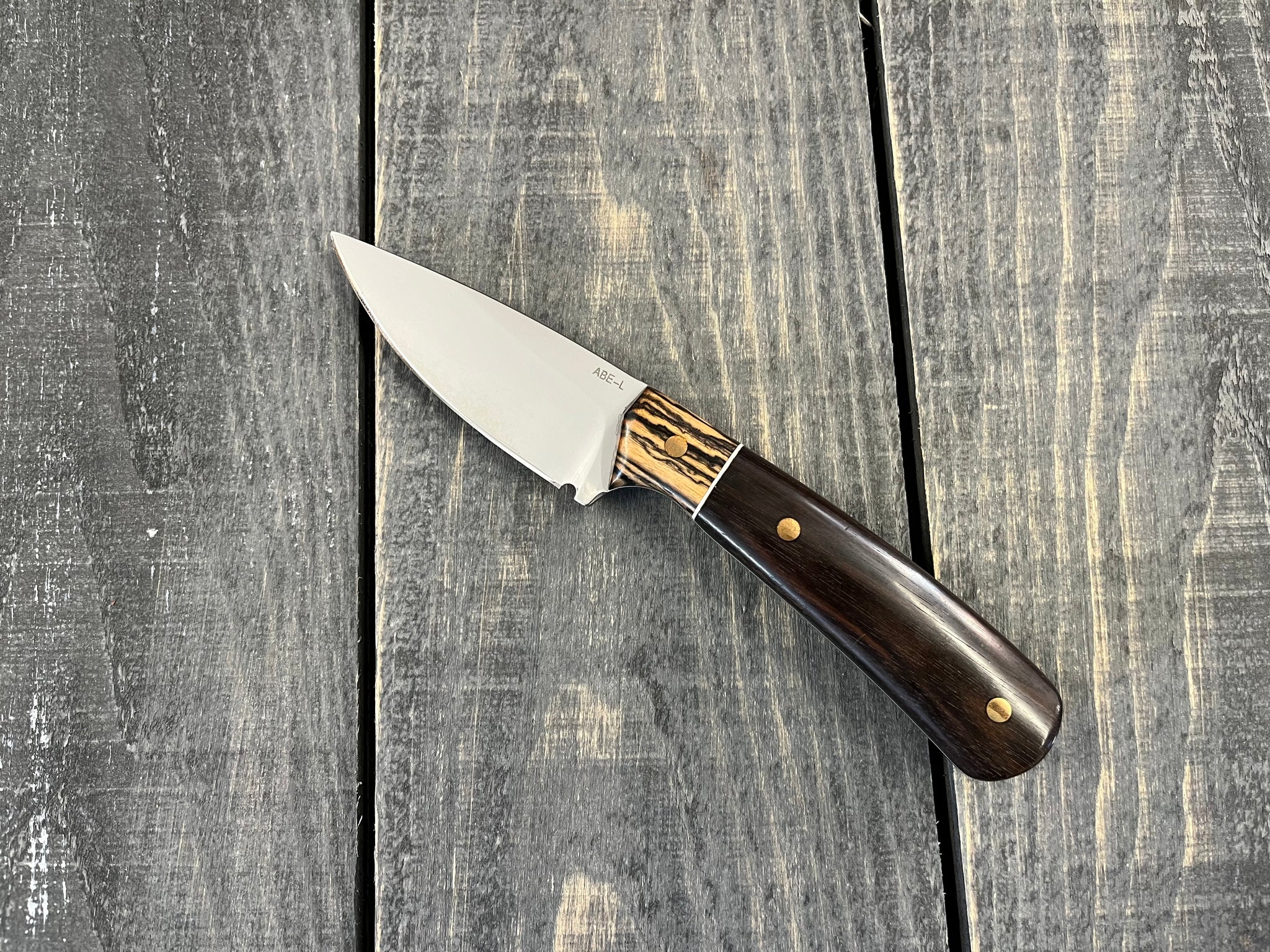 A great EDC knife.Overall length 7 1/2”.Blade from tip to bolster 3”. Handle material ebony. Steel AEBL. Sheath leather.
