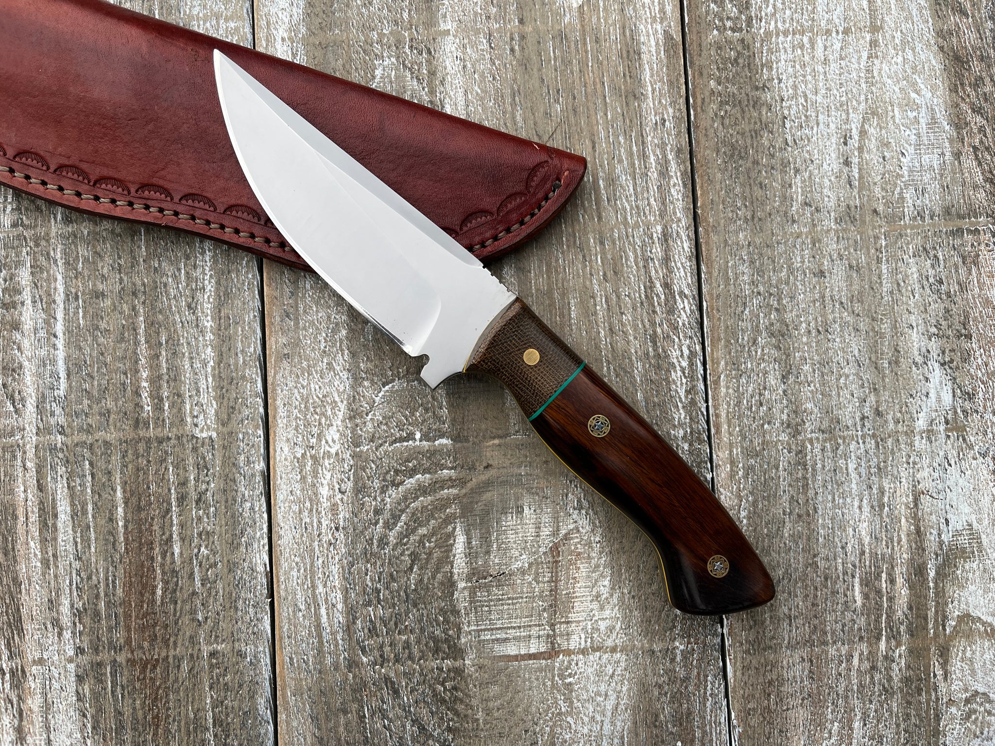 My standard Hunter,overall length 9”,Blade from tip to guard 4 1/2”,handle material desert ironwood,bolster canvas micarta,steel AEBL stainless,sheath leather.