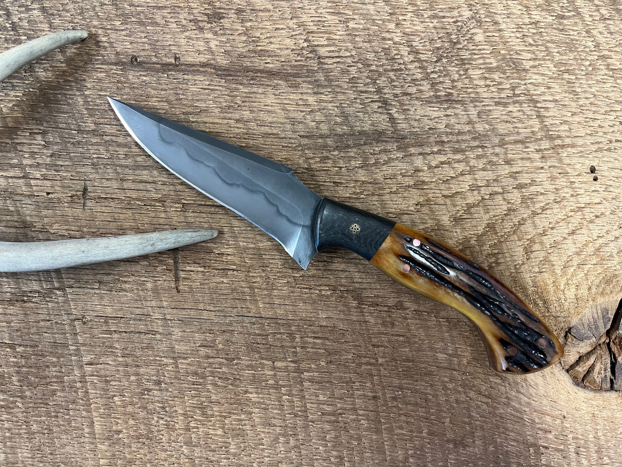 This knife style has been sought after by collectors, Overall length 9" blade 4 1/4" from tip to guard.handle material jig bone .Bolster carbon fiber steel W2 with a hamon.copper pins.Leather sheath.