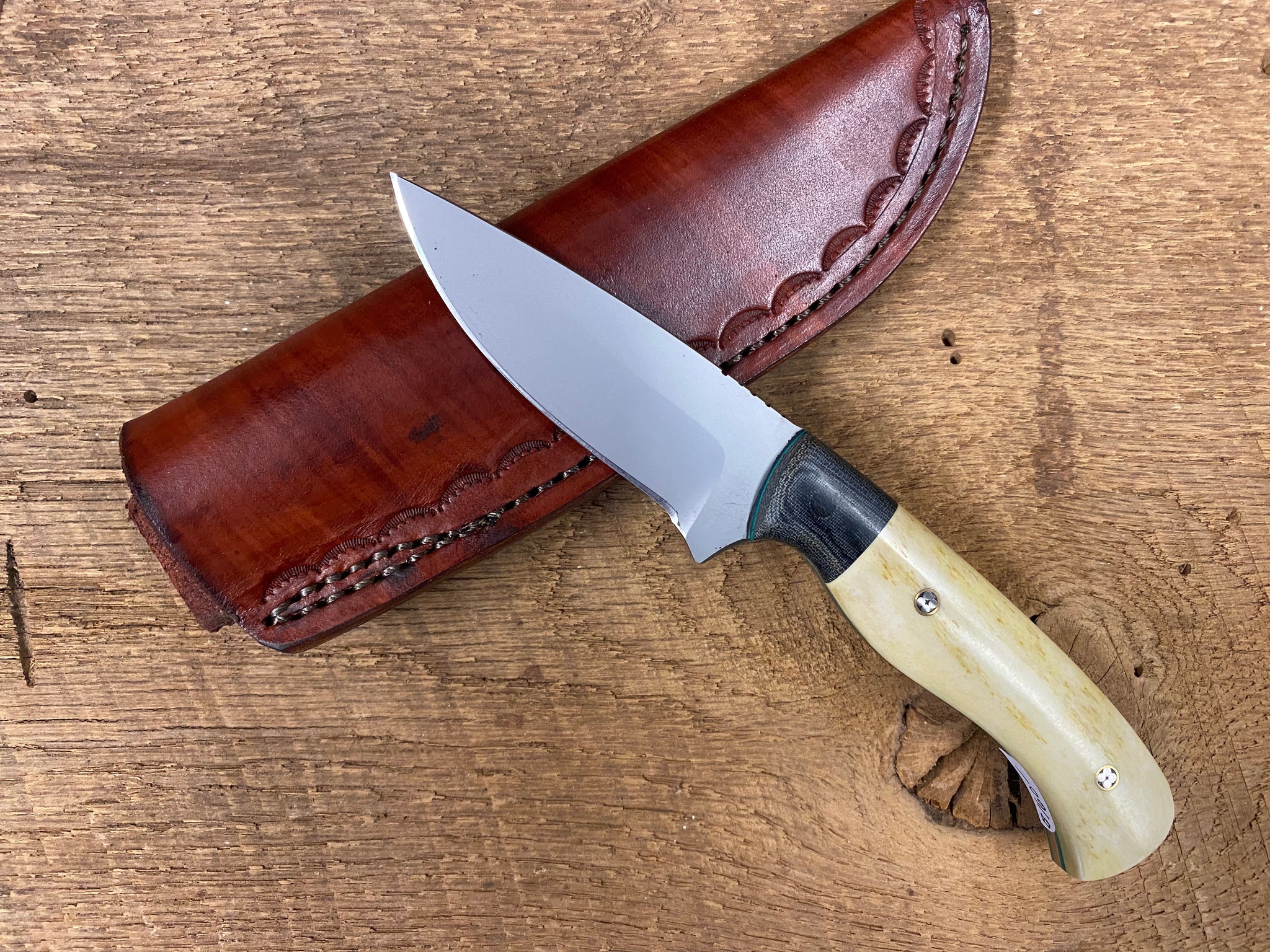 EDC knife, overall length 7 1/2 inches , handle material ,bone,Micarta bolster,Steel AEB-L.Sheath leather.