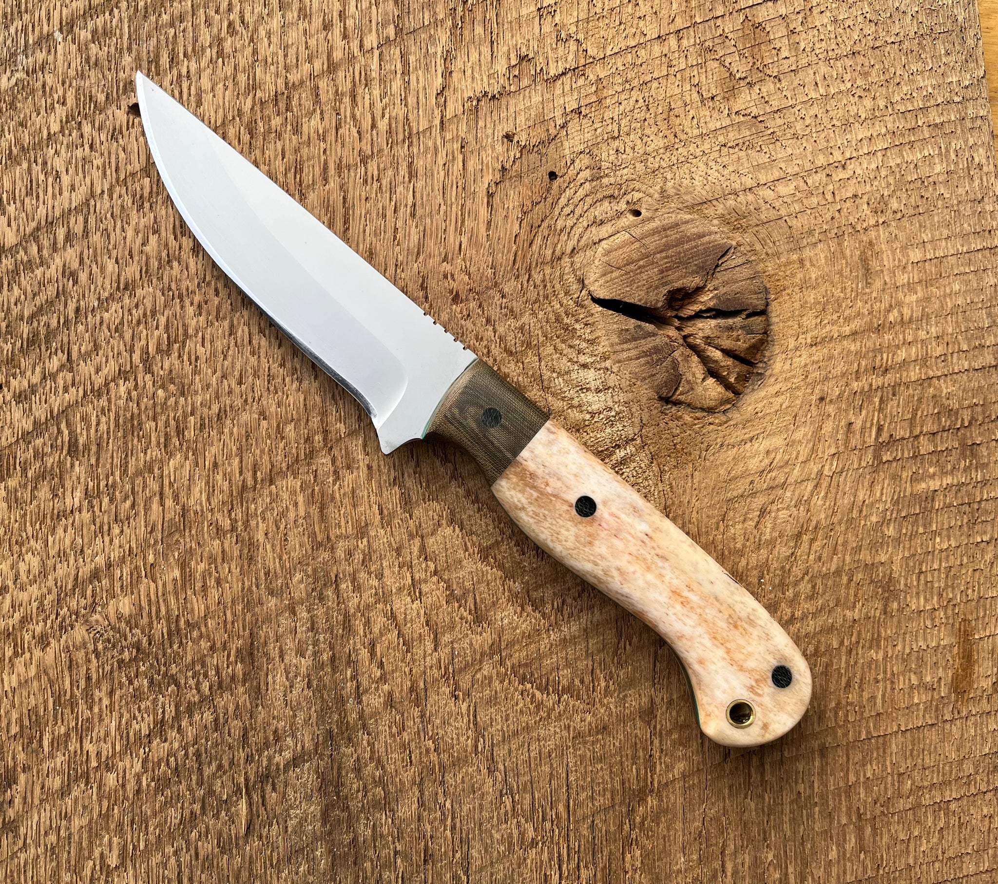 This is my standard hunter. An all around deer knife.Overall length 8 1/2”.Blade 4”. Handle material camel bone.bolster micarta.Steel aebl stainless steel.Sheath leather.