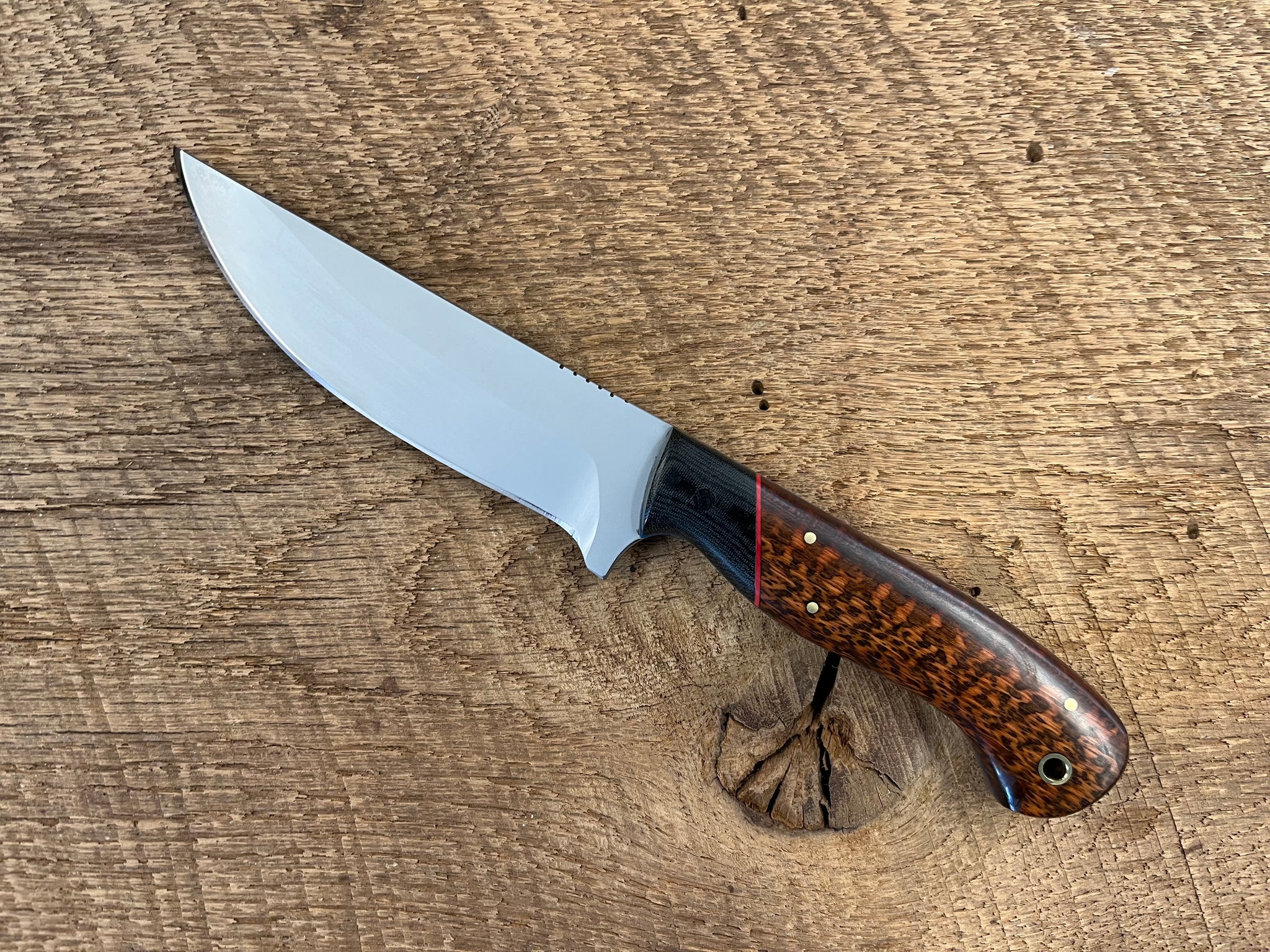 A bush craft design Knife, Over all length 10”.blade from tip to bolster 5”.Handle material rare snake wood.bolster micarta.Steel Aebl. Sheath leather.