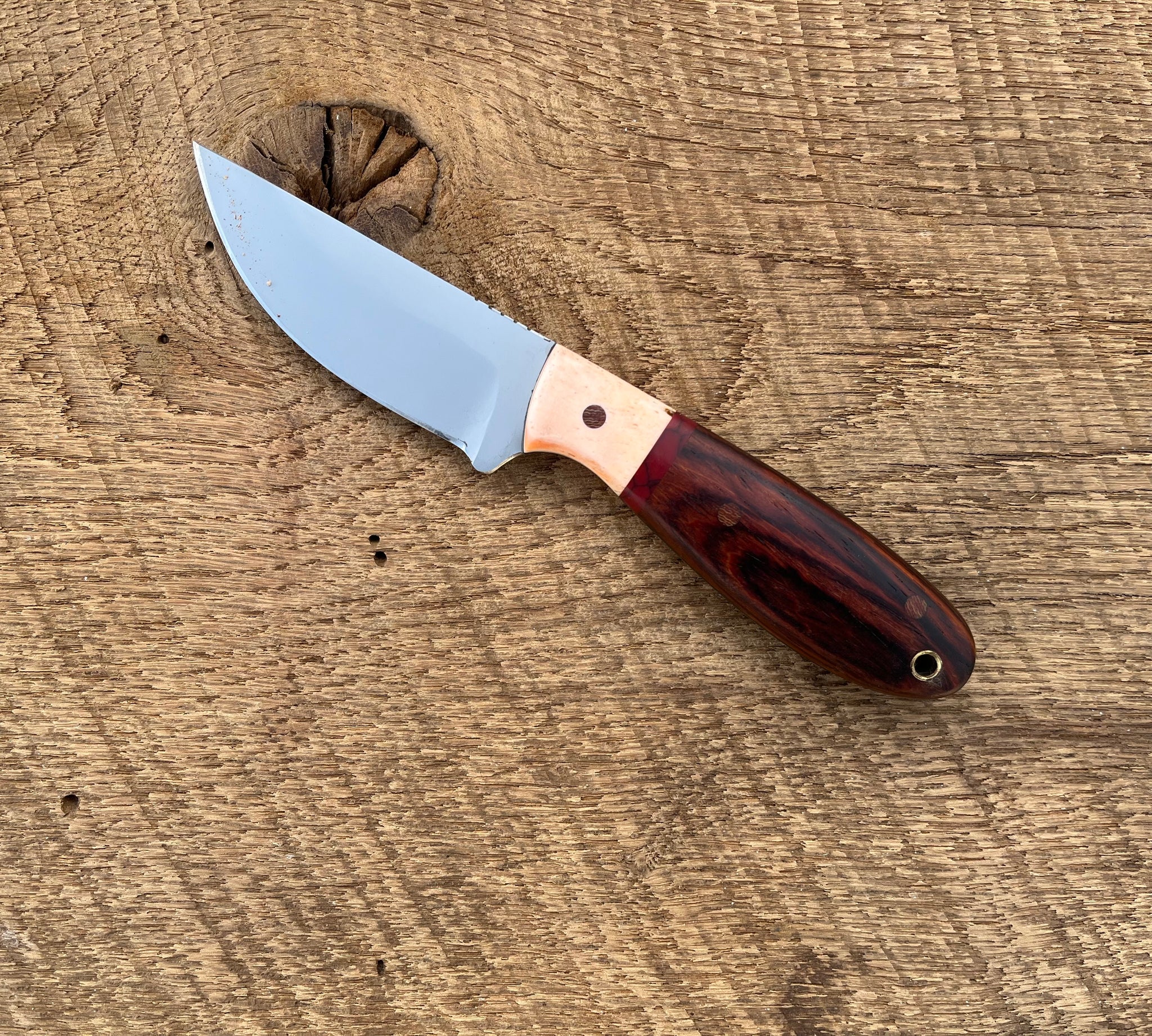 Hunter, Handle material cocobola.Bolster bone.overall length 7 3/4”.Steel AEBL stainless.spacer truestone spacer..Sheath leather.