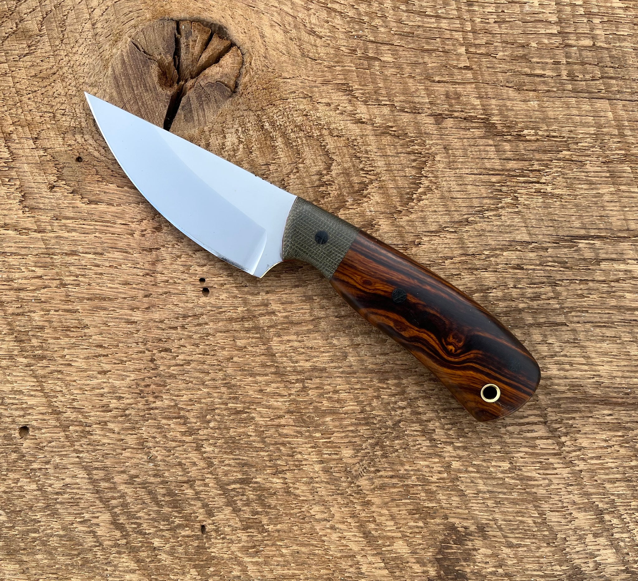 A great little EDC knife.overall length 7 3/4”.Handle material desert ironwood,bolster micarta.Steel AEBL stainless.red liner.sheath leather.